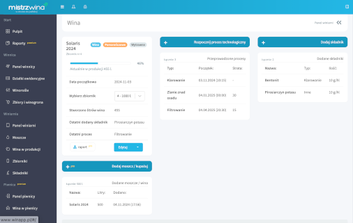 Rejestruj każdy etap procesu produkcji, umieść w zbiorniku, dodawaj składniki i analizuj historię tworzonych win.
